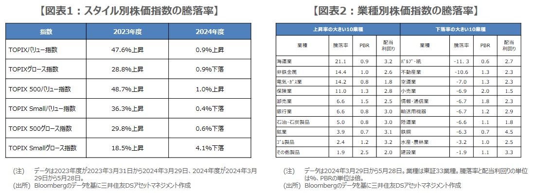 2023年度のスタイル別株価指数ではグロース株よりバリュー株、小型株より大型株が選好された