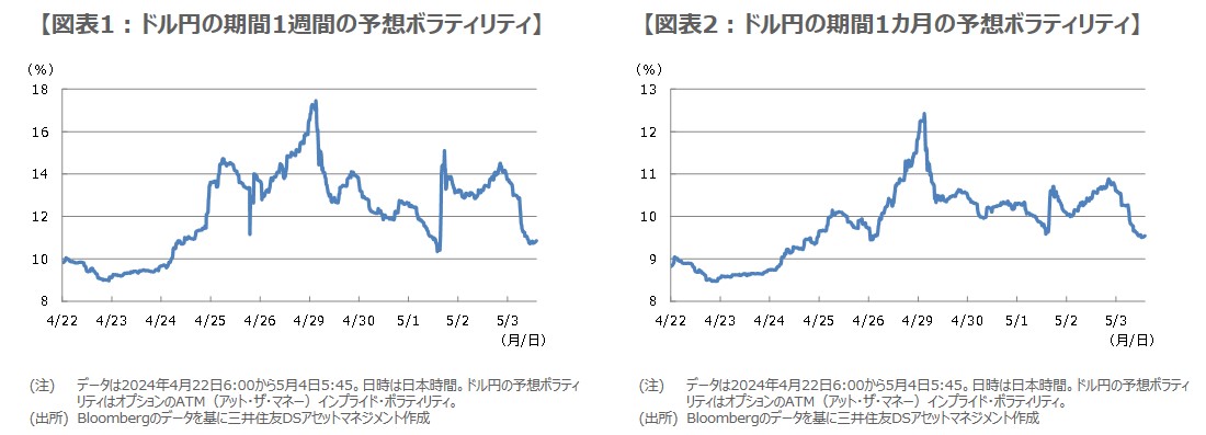 最終的な為替介入の判断は、ドル円の特定水準ではなく変動率(ボラティリティ)だったと考えます。4月29日前後の期間1週間と1カ月の予想ボラティリティの推移をみると、2ケタを大きく超えるか否かが判断の1つの目安になっているように見受けられます(図表1、図表2)。もちろん、これが唯一の基準とは限りませんが、この先、再び介入が実施される可能性を考える上で、ある程度、参考になると思われます。