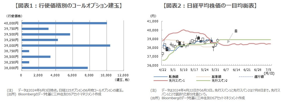 このように、来週の日経平均はSQ前に、建玉の積み上がった行使価格前後でボラティリティ急騰が見込まれますが、通常はSQ前のポジション調整に伴う一時的なものと判断されます。ただ、5月27日付レポートで解説した通り、今回は日経平均の日足が一目均衡表の雲(図表2、6月4日から7月8日までは38,200円付近~38,900円付近)を大きく上抜ければ上昇トレンド、下抜ければ下落トレンドを形成することになるため、注意が必要です。