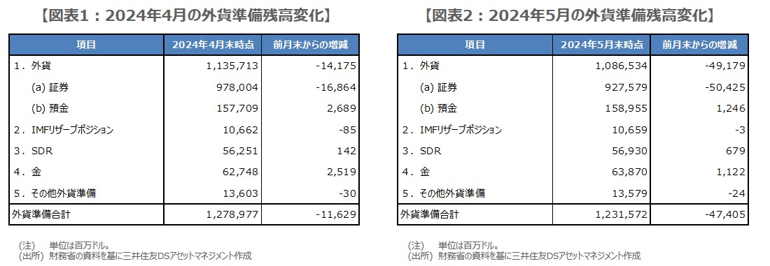 直近では、日本時間の4月29日午後と5月2日早朝に、ドル売り・円買い介入が行われたとみられていますが、その際の介入原資は、月次ベースで公表される速報性の高い外貨準備の内容を検証することによって確認できます。具体的には、4月29日分であれば3月末と4月末の外貨準備残高を、5月2日分であれば4月末と5月末の外貨準備残高をそれぞれ比較し、残高変化の大きい項目が、介入原資と推測されます。