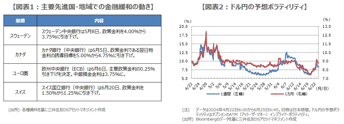 もとより、先般の日米金融政策会合で、米連邦準備制度理事会(FRB)の政策判断はデータ次第という基本姿勢と、日銀の極めて慎重な緩和修正の舵取りが、それぞれ確認されており、市場では日米金利差の高止まりは当面続くとの見方が強い状況です。また、主要先進国・地域で金融緩和の動きがみられるなか(図表1)、米政策金利の相対的な水準の高さが顕著となっており、これらがドル高・円安を進行させる一因になっていると考えます。