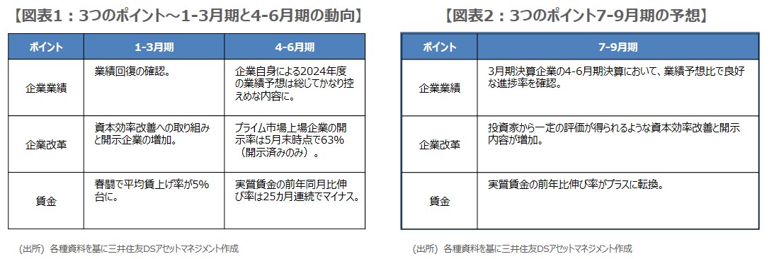 これまで、日本株の先行きを展望するにあたり、注目しておきたい3つのポイントとして、「企業業績」、「企業改革」、「賃金」を挙げてきました。これらは1-3月期にそろって改善傾向が確認されたため、日経平均は上昇、ただ4-6月期は目新しい動きがなかったため、上昇一服となったと考えています(図表1)。したがって、日経平均が上昇基調を回復するには、この3つのポイントについて、さらなる進展の材料が必要と考えます。