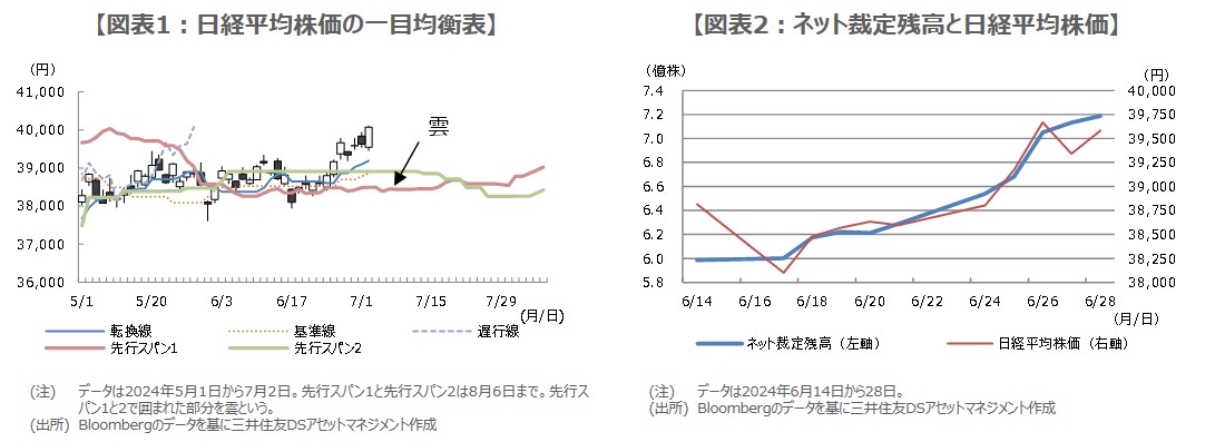 5月27日付レポートで紹介した一目均衡表をみると、7月2日時点で、①転換線が基準線を上抜け、②遅行線が日足を上抜け、③日足が雲(先行スパン1と先行スパン2に挟まれた領域)を上抜けており、「三役好転」という非常に強い買いシグナル(上昇トレンド)が確認されます(図表1)。このようなテクニカル要因も、日経平均が再び40,000円台を回復した背景にあると推測されます。