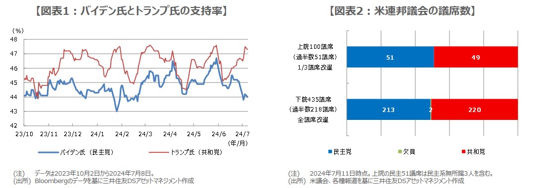 米国では6月27日、大統領選挙に向けたバイデン大統領とトランプ前大統領による第1回のテレビ討論会が南部ジョージア州アトランタで行われ、互いに90分間批判し合う展開となりました。ただ、バイデン氏は序盤から声がかすれ、途中で言葉を詰まらせる場面が何度もあり、米メディアからは健康状態を不安視する厳しい論調が広がりました。直近の各種世論調査の平均でも、バイデン氏の支持率の低下が目立ちます(図表1)。