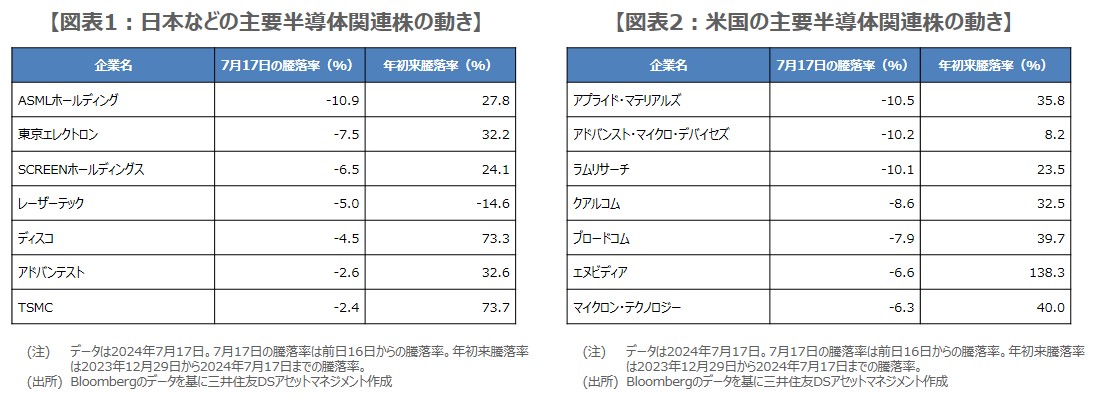 具体的に名前が挙がった半導体製造装置大手の東京エレクトロンは7月17日、前日比7.5%下落し、アドバンテストなど他の半導体関連銘柄にも売りが広がって(図表1)、日経平均株価の下げを主導しました。同じく名前が挙がったオランダのASMLホールディングは、市場予想を上回る良好な4-6月期決算を発表しましたが、この日の報道により、前日比10.9%下落し、売買停止となりました。