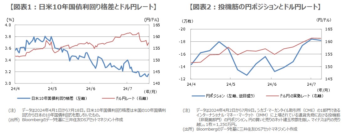 なお、米国ではインフレの落ち着きを評価する複数の米連邦準備制度理事会(FRB)高官発言を受け、9月の米利下げ開始がほぼ織り込まれました。日米長期金利差は縮小しつつありますが、ドル円相場との乖離は依然大きい状況です(図表1)。この背景には、投機筋が円売りポジ