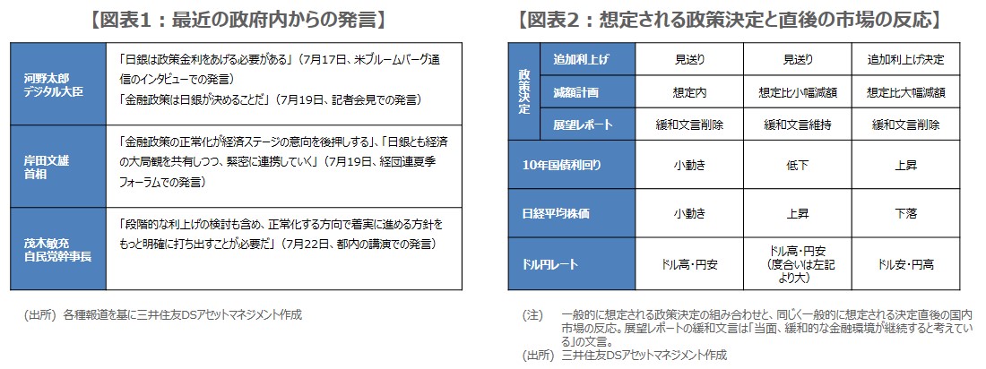日銀は7月30日、31日に金融政策決定会合を開催します。そこで、以下、今会合の注目ポイントについて整理していきます。まず、政策金利について、日銀は現在、無担保コール翌日物金利の誘導目標を0~0.1%程度としていますが、このところ、政府内から金融正常化を後押しする声が出ており(図表1)、市場の一部では、今会合で追加利上げが行われるとの見方が強まっています。