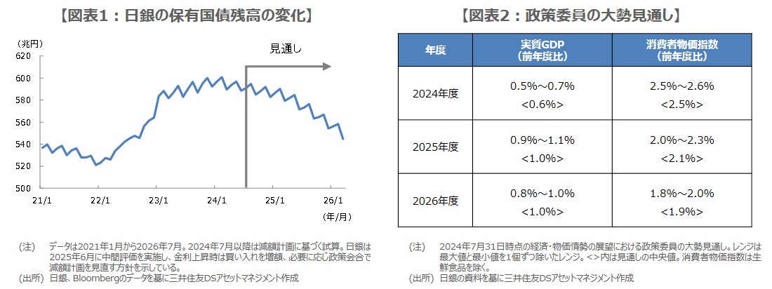 計画では、「原則として毎四半期4,000億円程度ずつ減額」という、具体的な金額とペースが示され、8月の買い入れ予定も、1回あたりのオファー金額と月間のオファー金額が明示されました。また、日銀の保有国債残高は、2026年3月までにおおよそ7~8%減少するという見通しが示され(図表1)、植田和男総裁が6月に述べた通り、「予見可能な形で減額していく」、分かりやすい減額計画になったと思われます。