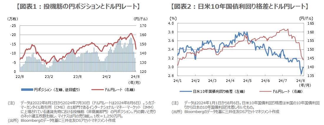 もともとドル円が161円台まで進んだ背景には、日銀と米連邦準備制度理事会(FRB)の慎重な政策運営の姿勢に、日米金利差はしばらく縮小しないであろうとの市場の見方があったと推測されます。こうしたなか、先月の日銀追加利上げとFRBの9月利下げ示唆に加え、足元では米経済指標の下振れで景気先行き不安が急浮上し、日米金利差縮小の観測が強まったことで、一気にドル安・円高が進んだと考えられます。