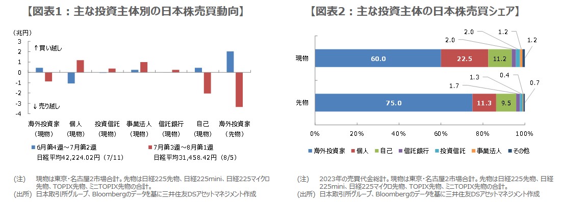 一般に、先物を取引する海外投資家には短期的な視点で売買を行う投機筋などが含まれるとされるため、投機筋による先物売りが、8月5日の日経平均の歴史的な急落の主因と考えられます。なお、日経平均が急速に上昇した6月第4週(6月24日~28日)から7月第2週(7月8日~12日)と、一気に失速した7月第3週(7月16日~19日)から8月第1週の、主な投資主体の売買動向は図表1の通りです。