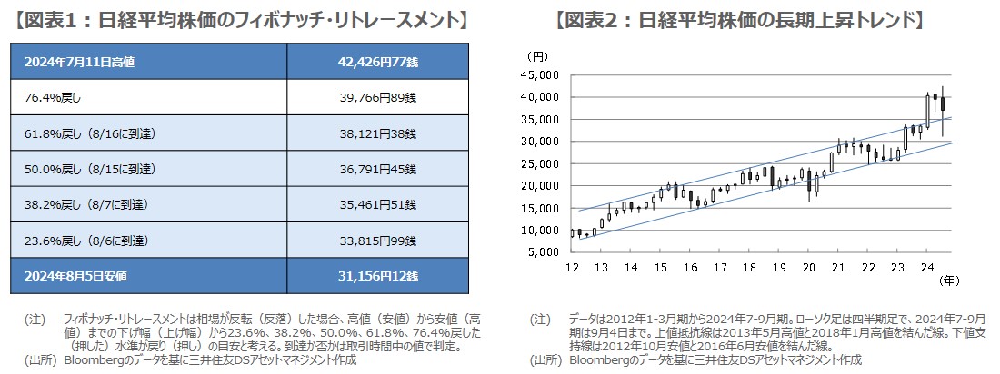 EPSの上昇には、米国景気の軟着陸(ソフトランディング)の実現性が高まり、ドル円相場が安定し、中間決算で企業の業績予想の上方修正期待が高まることが待たれます。さらに、国内外の投資家から高い評価が得られるような資本効率改善の取り組みが企業に広がり、2025年春闘で大幅な賃上げが続く流れとなれば、図表1の76.4%戻し(39,766円89銭)の達成は十分視野に入ると思われます。