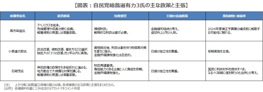 また、高市氏、小泉氏、石破氏が激しく争う展開と報じられていることから、以下、改めて3氏の主な政策と主張を比較し(図表)、市場への影響について考えます。まず、経済政策について、高市氏はアベノミクスを継承し、危機管理や成長分野への投資を訴えています。小泉氏は、政治改革、規制改革、働き方などの選択肢拡大を1年以内に実施するとしています。石破氏は、岸田政権の政策を引き継ぎ、地方創生も政策の柱に据えています。