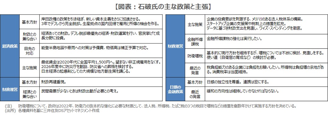 石破氏の主な政策と主張は図表の通りですが、石破氏は総裁選後に出演したテレビ番組で、「必要であれば財政出動する」、「民間需要が少ないときは財政出動しないと経済が持たない」と述べています。また、日銀の判断なので政府が言うことではないとしつつも、「金融緩和の方向性は維持していかなければならない」との見解を示し、「貯蓄から投資の流れをもっと加速していかなければならない」と明言しました。