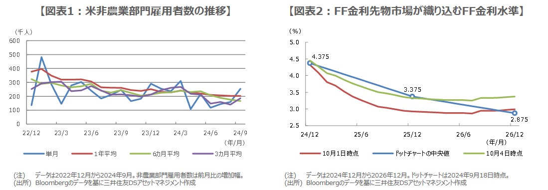 一方、フェデラルファンド(FF)金利先物市場に目を向けると、10月1日時点でFF金利は2025年末にかけて3%を割り込む動きが見込まれており、米連邦公開市場委員会(FOMC)メンバーが「政策金利水準の分布図(ドットチャート)」で示すFF金利の適正水準(中央値)を大きく下回っていました(図表2)。ただ、今回の雇用統計を受け、10月4日には2025年の大幅利下げの織り込みが一気に修正され、これがドル高・円安の一因となりました。