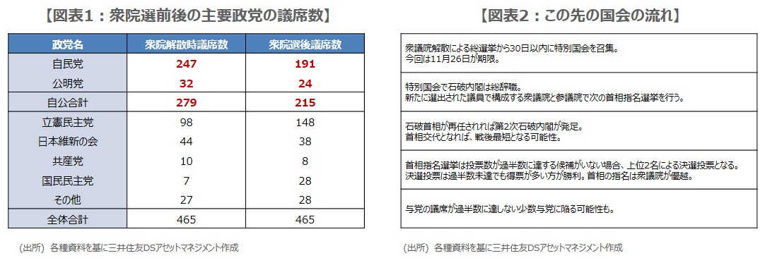 第50回衆議院議員総選挙(定数465議席)は10月27日に投開票が行われ、28日の未明に全議席が確定しました。与党の自由民主党(以下、自民党)と公明党の議席数は215議席と、公示前の279議席を下回り、過半数(233議席)を割り込む結果となりました(図表1)。一方、立憲民主党と国民民主党は、それぞれ148議席(公示前98議席)、28議席(同7議席)と、議席数を伸ばし躍進しました。