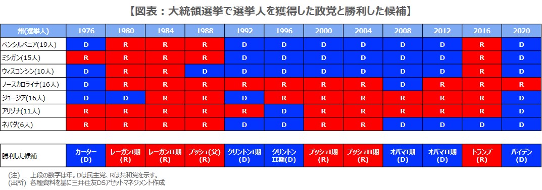 一般に、激戦州といわれているのは、東部ペンシルベニア州、中西部ミシガン州、同ウィスコンシン州、南部ノースカロライナ州、同ジョージア州、西部アリゾナ州、同ネバダ州の7州です。ペンシルベニア、ミシガン、ウィスコンシンの3州は、「ラストベルト(さびた工業地帯)」に位置し、かつては民主党の強固な支持基盤でしたが、2016年の大統領選挙でトランプ氏が3州すべてを制して勝利したことで、激戦州となりました。