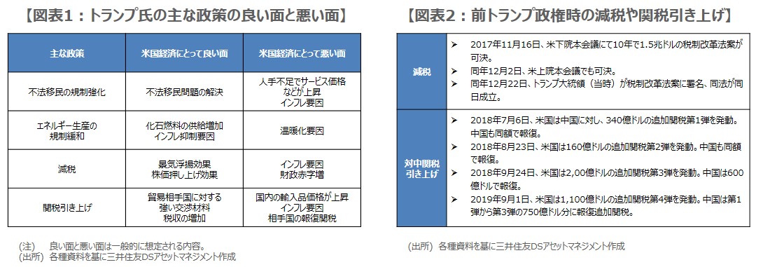 トランプ氏の大統領就任後、早々に着手が予想されるのは、不法移民対策やエネルギー生産の規制緩和などですが、現時点で各政策の具体的な内容や優先順位については、まだ明確ではありません。トランプ氏の主な政策は、米国経済にとって良い面だけでなく、悪い面もあるため(図表1)、市場は期待や思惑に振れやすい状況にあり、特に減税や関税引き上げには高い関心が集まっています。