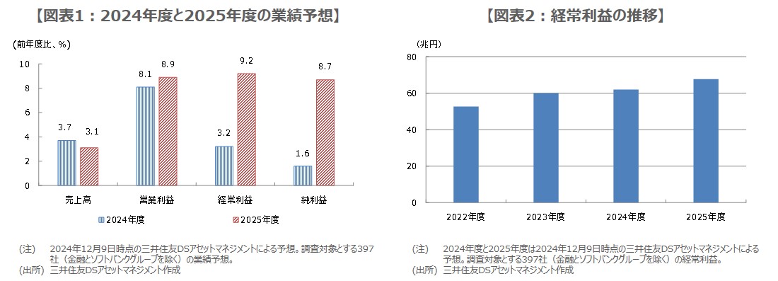 次に、2024年度の業績について、前年度比の売上高は3.7%増、営業利益は8.1%増、経常利益は3.2%増、純利益は1.6%増を想定しています(図表1)。経常利益と純利益の伸びは1ケタに鈍化するものの、引き続き増収増益を見込んでいます。2025年度は、前年度比の売上高が3.1%増、営業利益は8.9%増、経常利益は9.2%増、純利益は8.7%増とみており、経常利益と純利益の伸びが拡大し、2025年度も増収増益を予想しています。