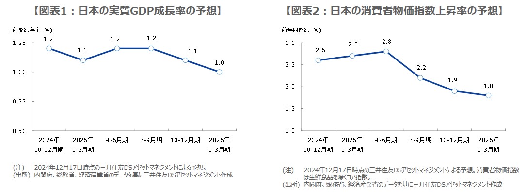 金融政策について、日銀は2025年1月の金融政策決定会合で公表する経済・物価情勢の展望(展望レポート)にて、国内の経済および物価、米国を中心とする海外経済を総合的に点検し、無担保コール翌日物金利の誘導目標を0.25%程度から0.50%程度へ、25ベーシスポイント(bp、1bp=0.01%)引き上げると予想しており、その後は、半年に1回程度の緩やかな利上げペースを見込んでいます。