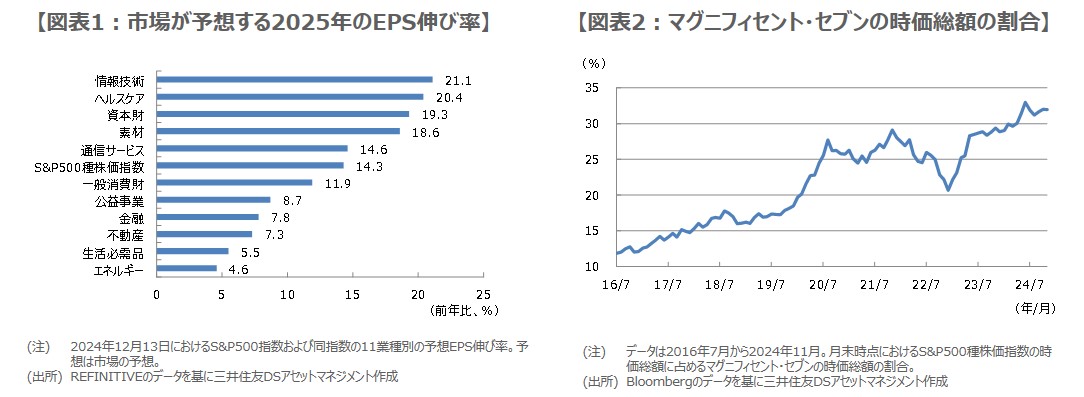 2025年の1株あたり利益(EPS)の伸び率について、直近の市場予想ではS&P500指数全体で前年比+14.3%となっています(図表1)。業種別では、一般消費財(アマゾン、テスラなど)が同+11.9%、情報技術(アップル、マイクロソフト、エヌビディアなど)が同+21.1%、通信サービス(グーグルの持ち株会社アルファベット、メタなど)が同+14.6%と、MAG7を含む業種は、いずれも良好な見通しが確認されます。