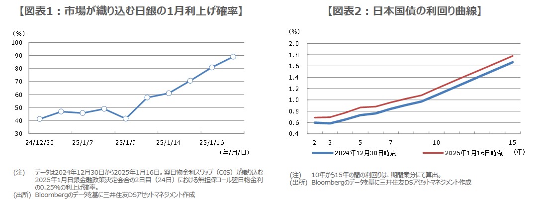 こうしたなか、時事通信社は1月15日、米ブルームバーグ社は16日、トランプ次期米大統領の20日の就任式における言動で金融市場が大きく混乱しない限り、日銀は23日、24日の金融政策決定会合で利上げを決定する公算が大きい旨を報じました。氷見野副総裁、植田総裁の発言や、複数メディアの報道を受け、市場では1月利上げの織り込みが急速に進んでいます(図表1、2)。