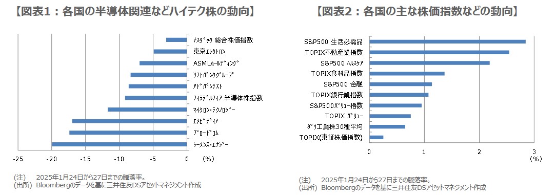 主要国の株式市場では1月27日、中国のAI(人工知能)開発企業「DeepSeek」が発表した最新の高性能生成AIモデルによって米ハイテク企業の優位性が揺らぎかねないとの警戒が強まり、半導体関連などのハイテク株に売りが広がりました。国内市場では、米ナスダック100指数の先物が下落するなか、アドバンテストや東京エレクトロンなどの値がさの半導体関連株が大きく崩れ、日経平均株価を押し下げました。