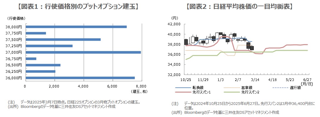 このように、今週の日経平均は、建玉の積み上がった行使価格前後でボラティリティ急騰が見込まれますが、通常はSQ前のポジション調整に伴う一時的なものと判断されます。なお、日経平均の週足の一目均衡表をみると(図表2)、36,400円台が目先の下値支持線となる可能性が高く、SQを通過した後の日経平均がこの水準で下げ止まることができれば、反転上昇の展開も期待されます。