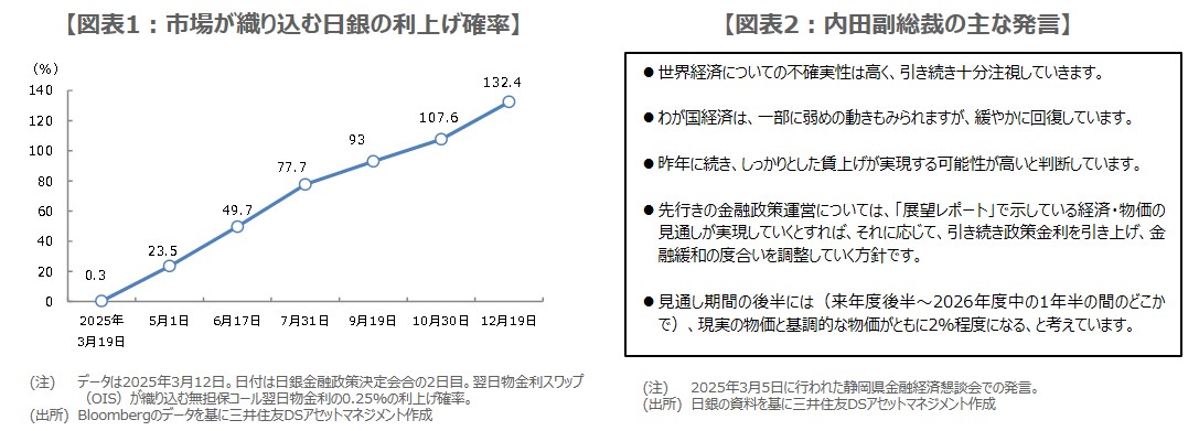 なお、会合の直前に行われる日銀政策委員の講演も重要な手掛かりです。今回は3月5日に内田真一日銀副総裁が講演を行いましたが、主な発言は図表2の通りです。植田総裁の記者会見での発言も、おおむね同じ内容となると思われ、タカ派過ぎずハト派過ぎず、バランスに配慮しつつ踏み込んだ情報発信は避け、前述の基本的な金融政策の運営スタンスを繰り返し述べる可能性が高いとみています。