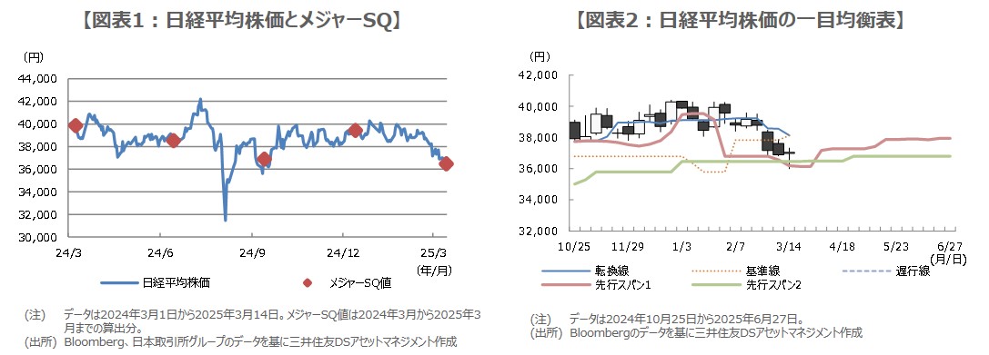 なお、14日の日経平均は37,053円10銭で取引を終え、SQ値を約570円上回りました。3月10日付レポートでも解説していますが、メジャーSQが算出される週は株価が大きく上下することが多く、先週の日経平均にもその動きがみられました。メジャーSQ前の株価変動はポジション調整に伴う一時的なものですが、SQ値は日経平均株価の「戻り高値」や「押し安値」となる傾向があります(図表1)。