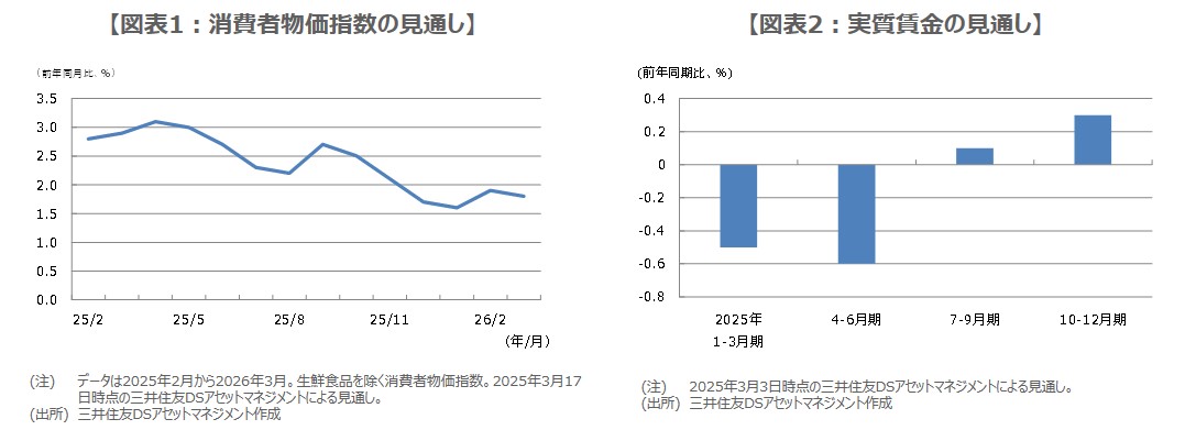 弊社はコアCPIの見通しを、2025年度が前年度比2.3%上昇、2026年度は同1.6%上昇としています。賃上げに伴うサービス価格の上昇がコアCPIの伸びを支え、教育無償化の影響を除けば、コアCPIは2%程度の上昇のモメンタム(勢い)は維持できると考えており、日銀は2025年度に2回、2025年7月と2026年1月に25ベーシスポイント(bp、1bp=0.01%)ずつ利上げを行うとみています。