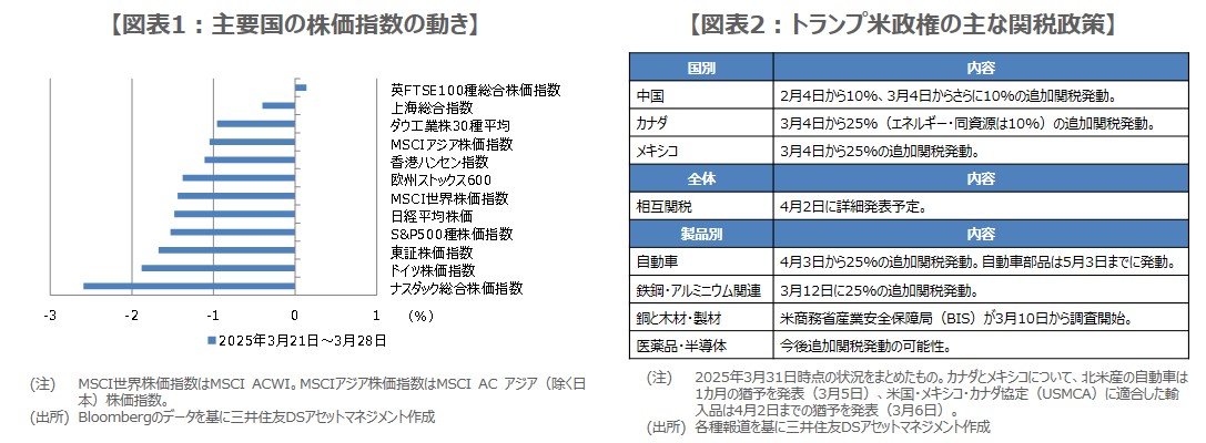トランプ米大統領は3月26日、輸入自動車に25%の追加関税を4月3日から課すと発表しました。また、報道によると、遅くとも5月3日までに、エンジンなどの自動車部品にも25%の追加関税が発動される見通しです。これを受け、市場では改めてトランプ関税への警戒感が強まり、米国をはじめとする主要国の株価指数は先週、大きく値を崩す展開となりました(図表1)。