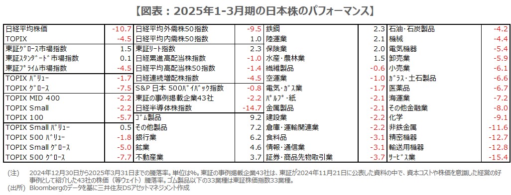 ●2025年1-3月期に日経平均は値がさ株の下げの影響で10.7%下落し、TOPIXは4.5%下落。