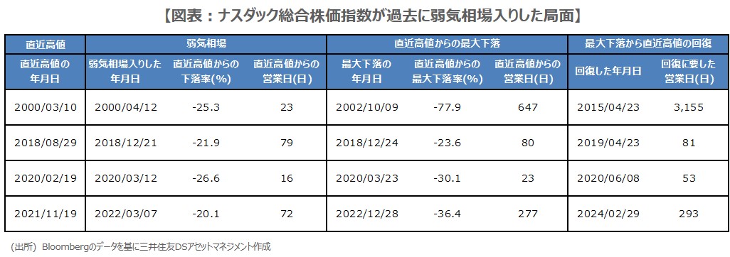 ③はコロナ・ショックによる弱気相場入りでしたが、積極的な金融財政政策がとられたことで、2020年2月19日につけた高値を6月8日には回復するなど、②よりもさらに短期間で収束しました。そして、④は米国の物価上昇が弱気相場入りの主因でしたが、当時は米利上げ開始が遅れたとの指摘もあり、ナスダックは弱気相場入り後も下げが続き、2021年11月19日の高値を回復したのは、2024年2月29日でした。