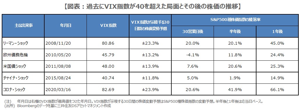 2008年以降、VIX指数が40を超えた局面は5回ありました(今局面は除く)。具体的には、①2008年のリーマン・ショック、②2010年の欧州債務危機、③2011年の米国債ショック(米国債の格下げによる市場の混乱)、④2015年のチャイナ・ショック、⑤2020年のコロナ・ショックの時ですが(図表)、今回のVIX指数の52.33は、まだリーマン・ショックやコロナ・ショックほどではありませんが、かなり大きな数値であることが分かります。