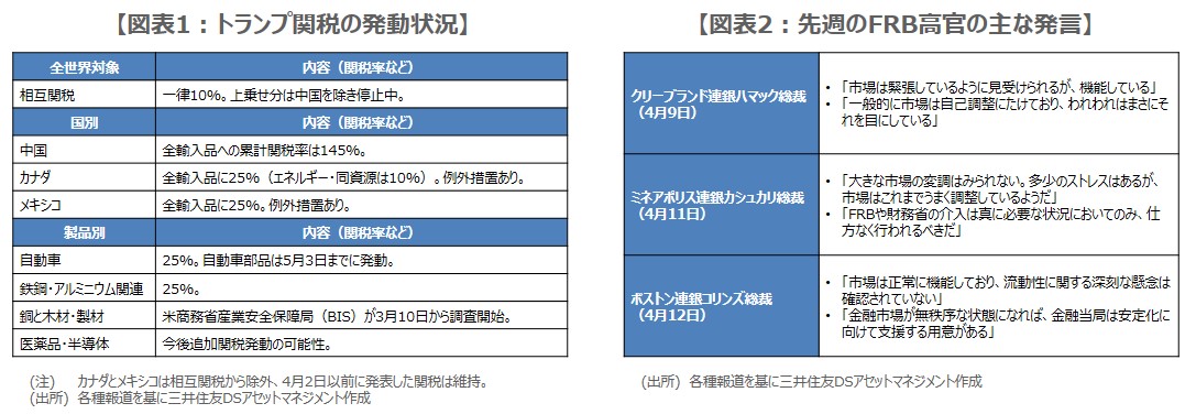 トランプ米大統領も13日、除外された製品は単に別の関税カテゴリーに移行するだけというコメントを自身のSNSに投稿しており、詳細については14日に説明される見通しとなっています。なお、現時点におけるトランプ関税の発動状況は図表1の通りで、大きく全世界対象、国別、製品別に区分されますが、それぞれ朝令暮改の政策方針に市場が振り回されている状況です。