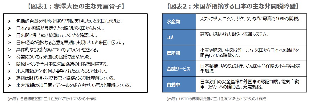 赤澤氏の説明によると(図表1)、日本は今回、包括的合意を可能な限り早期に実現したいとの意向を米国に伝え、米国からは日本との協議を最優先するとの説明があったとのことです。ただ、具体的な協議内容についてのコメントはなく、今月中に次回の協議日程が調整されることとなりました。また、為替は今回協議されず、赤澤氏は為替について米国側は財務相・財務長官で協議するものと理解していると述べました。