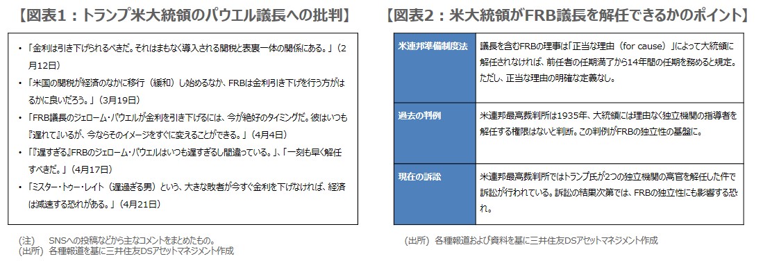 大統領からFRB議長への利下げ圧力が続くなか(図表1)、4月21日の米国市場では、FRBの独立性が損なわれるとの強い警戒が広がりました。この日は、ダウ工業株30種平均、S&P500種株価指数、ナスダック総合株価指数がそろって2%超下落し、安全資産とされる米国債も長期債を中心に軒並み下落(利回りは上昇)、米ドルは対主要通貨でほぼ全面安となるなど、再び「米国売り」の様相が強まりました。