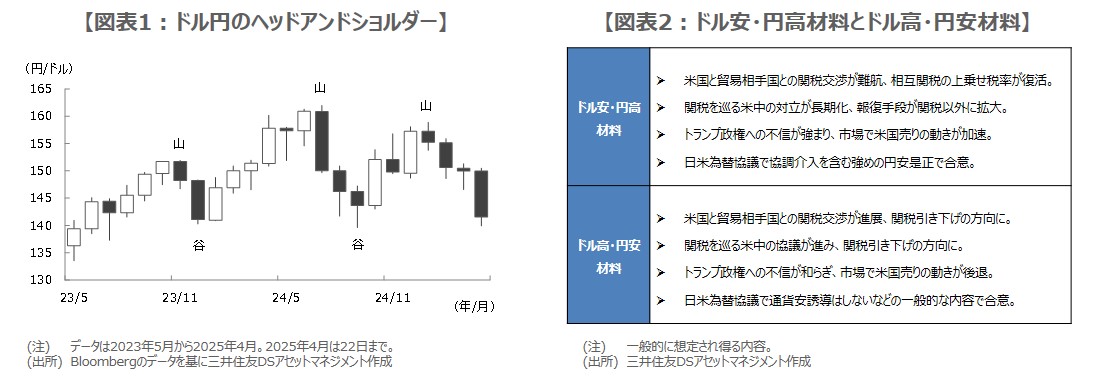 ドル安・円高の材料は、米関税政策の強化、米国売りの加速、円安是正の強めの日米為替合意などであり、ドル高・円安の材料は、これらが逆の動きになることと考えています(図表2)。トランプ氏は、自らの強気姿勢で国内経済や金融市場に深刻な悪影響が及ぶことは避けたいというのが本音と推測され、時間の経過とともに強気姿勢は緩和方向に修正され、ドル高・円安材料の要素が強まるのではないかとみています。