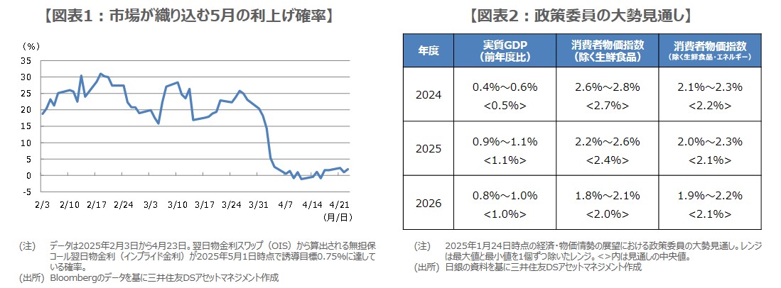 日銀は4月30日、5月1日に金融政策決定会合を開催します。弊社は無担保コール翌日物金利の誘導目標(現行0.50%程度)について、前回3月の会合に引き続き、今回も据え置きを予想していますが、市場でも据え置きはほぼ織り込み済みとなっています(図表1)。なお、今回は「経済・物価情勢の展望(展望レポート)」が公表されるため、植田和男日銀総裁の記者会見における発言とともに、注目が集まっています。