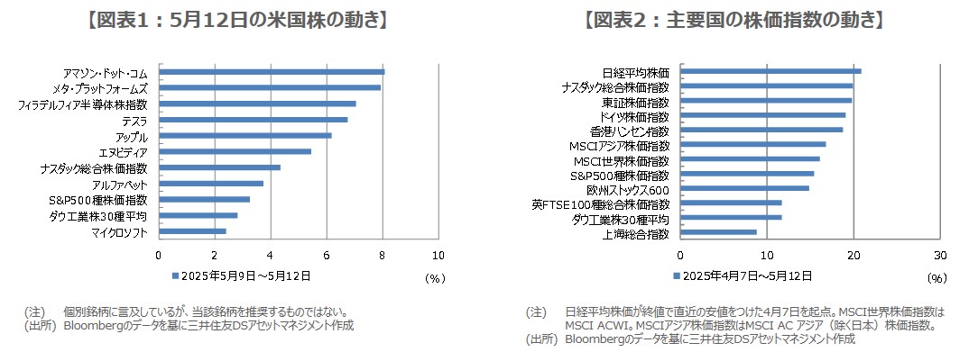 5月12日の米金融市場では、米中の関税引き下げ合意を受け、リスクオン(選好)の反応がみられ、ダウ工業株30種平均は前週末比2.8%上昇、S&P500種株価指数は同3.3%上昇、ナスダック総合株価指数は同4.3%上昇しました(図表1)。また、米国債の利回りが軒並み上昇し、米ドルは対主要通貨でほぼ全面高の展開となり、ドル円はドル高・円安が進行し、一時1ドル=148円64銭水準をつけています。