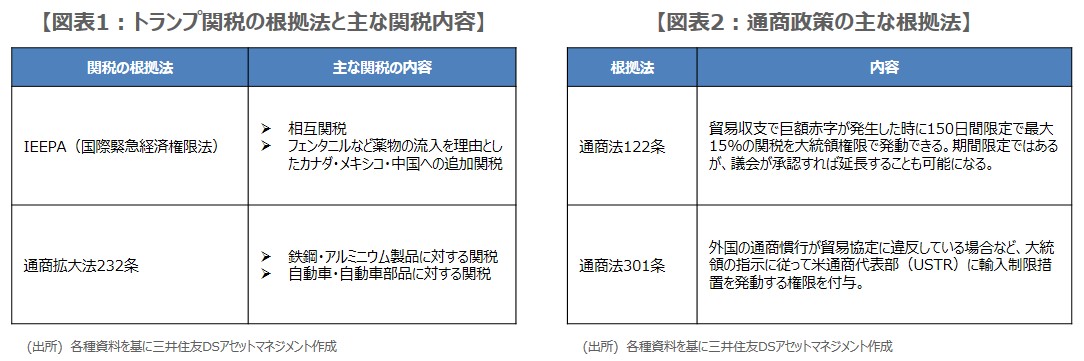 米国際貿易裁判所は5月28日、トランプ米政権が発動した一部の関税措置について差し止めを命じました。差し止めが命じられたのは、「IEEPA(国際緊急経済権限法)」を根拠にした措置であり、これには相互関税や、フェンタニルなど違法薬物の流入を理由としたカナダ・メキシコ・中国への追加関税が含まれます(図表1)。一方、「通商拡大法232条」に基づき発動された、鉄鋼・アルミニウム製品、自動車などに対する関税には影響が及びません。