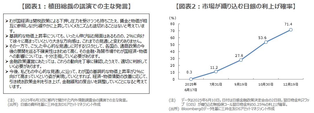 植田総裁の発言に関しては、金融政策の運営に関する見解が注目されますが、6月3日に都内で開かれた内外情勢調査会での講演が参考になると思われます(図表1)。植田総裁は、賃金と物価が相互に参照しながら緩やかに上昇していくメカニズムについて、米関税政策による下押し圧力を受けつつも「持ちこたえ」、「途切れることはない」と述べ、基調的な物価上昇率が2%に向けて徐々に高まっていくとの見方は不変との見解を示しました。