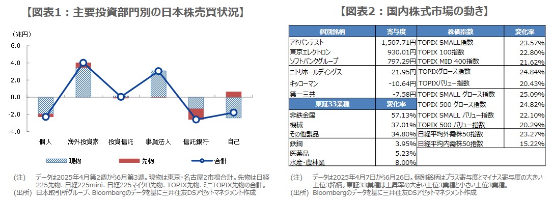 日経平均の年初から足元までの動きを振り返ると、日経平均は1月7日につけた年初来高値40,083円30銭(終値ベース、以下同じ)から、4月7日の年初来安値31,136円58銭まで22.3%下落し、その後は6月26日まで27.1%上昇しました。上昇期間における主な投資主体の売買状況をみると、海外投資家が約3.5兆円、事業法人が約3.1兆円、それぞれ現物を累計で買い越しており(図表1)、株高のけん引役になったとみられます。