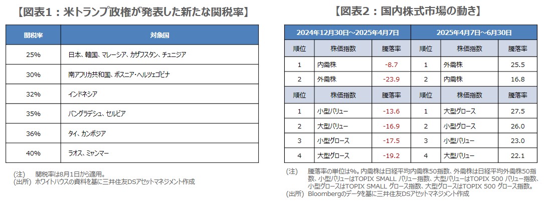 日本株は、昨年末から、日経平均株価が米関税政策の懸念などを背景に年初来安値をつけた4月7日までの期間、外需株より内需株、グロース株よりバリュー株、大型株より小型株のパフォーマンスが相対的に良好でした(図表2)。ただ、4月7日から日経平均が年初来高値をつけた6月30日までの期間ではこれらがほぼ逆転しました。今後、米関税政策への悲観が強まれば前者、楽観が強まれば後者のような動きになりやすいと思われます。