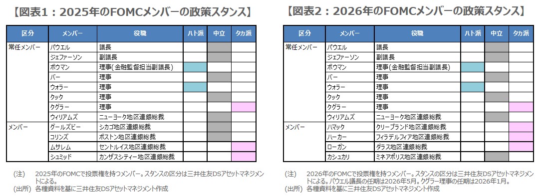 ただ、早期指名自体が市場のFRBに対する信任に影響を及ぼす恐れがあり、候補者が誰であれ、指名承諾は難しい判断になると推測されます。なお、トランプ米政権は、クグラー理事(任期は2026年1月)の後任に、議長候補を選ぶことも検討しているようですが、そもそも政策変更は、当然ながら大統領の意向ではなく、雇用や物価情勢をもとに判断され、米連邦公開市場委員会(FOMC)で投票権を持つメンバーの投票で決定されます(図表1、2)。