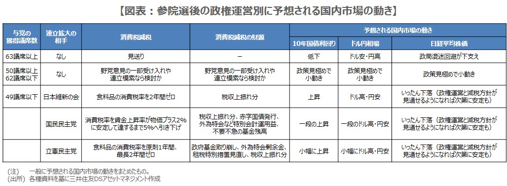 参議院選挙の投開票日が7月20日に迫るなか、終盤の情勢が明らかになり、自民党、公明党の両党の苦戦を伝える報道が目立っているように思われます。すでに6月6日付レポートや、7月7日付レポートで、与党の改選議席の獲得数に基づく3つのシナリオを想定し、市場への影響を考察していますが、今回は参院選後の政権運営に焦点をあて、国内の長期金利、ドル円相場、株価の方向性を探ります(図表)。