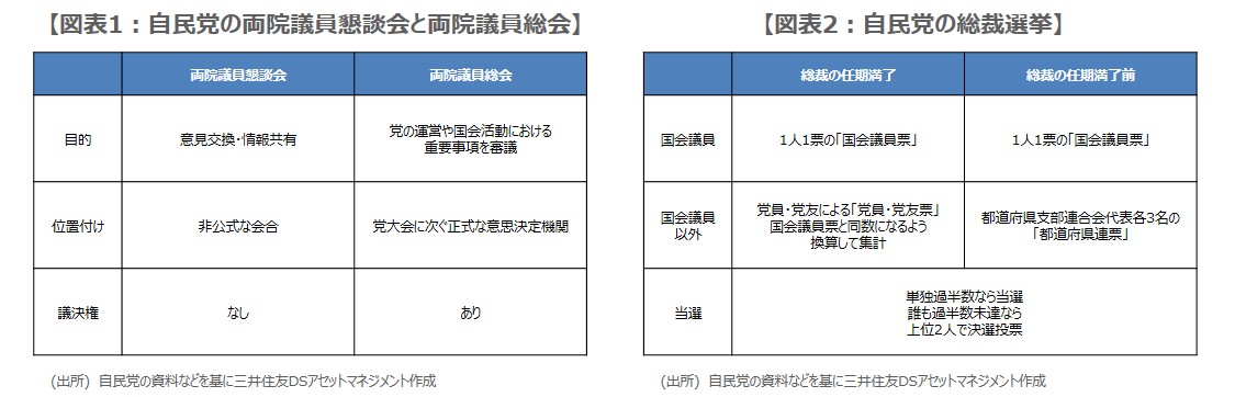 懇談会は意見交換の場にとどまりますが、総会は自民党の党則上、党大会に次ぐ正式な意思決定機関です(図表1)。党の運営や国会活動における重要事項を審議、決定し、緊急時は総会の決定をもって党大会の議決に代えることができるとされています。総会は1月の通常国会の召集日などに開かれますが、党所属議員の3分の1以上から要求があれば7日以内に招集され、今回の開催はこのケースに該当します。