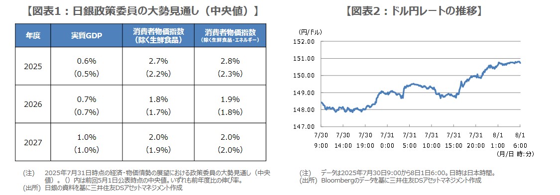 日銀は7月30日、31日に金融政策決定会合を開催し、弊社を含む大方の予想通り、無担保コール翌日物金利の誘導目標(現行0.50%程度)を4会合連続で据え置くことを決定しました。同時に公表された「経済・物価情勢の展望(展望レポート)」では、事前の報道通り、2025年度の経済および物価見通しが上方修正され、また、物価見通しは2026年度と2027年度も上方修正されました(図表1)。
