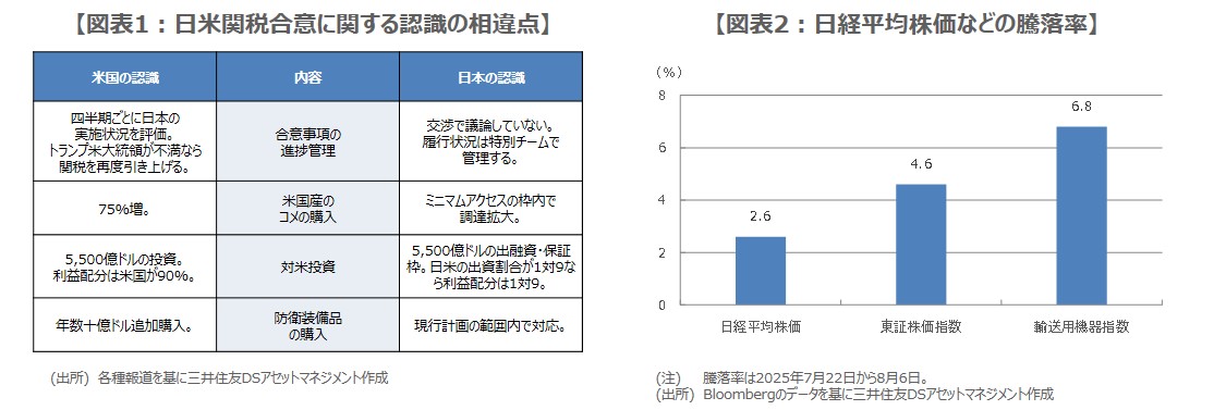 例えば、合意事項の進捗管理について、米国側は四半期ごとに日本の実施状況を評価し、トランプ米大統領が不満を感じれば関税を再度引き上げるとの考えを示していますが、日本側は交渉で議論していないとの見解で、履行状況は特別チームで管理するとしています(図表1)。このほかにも、米国産のコメの購入や対米投資などに関しても、両国の主張に相違点がみられます。