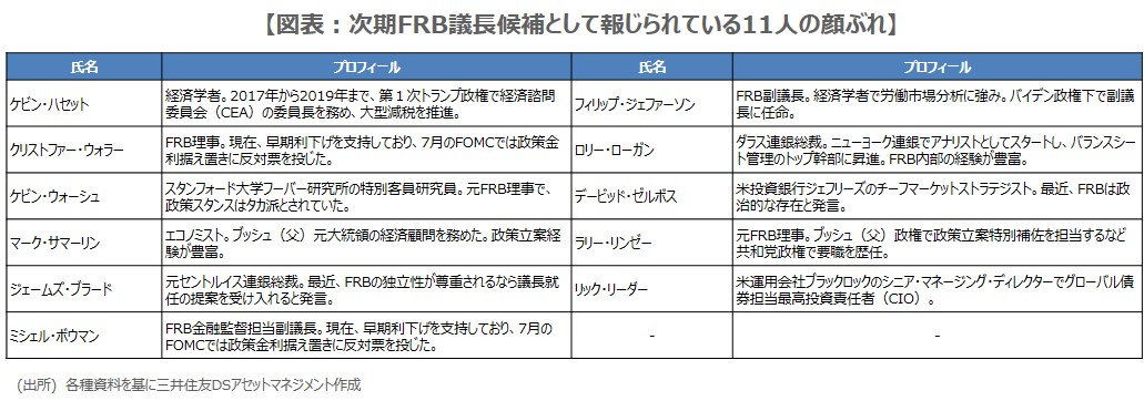 11人の顔ぶれは図表の通りですが、報道によると、ベッセント米財務長官が次期FRB議長の選定を主導し、より多くの候補者と面接した上で、最終候補者リストをトランプ氏に提出するとみられます。なお、ベッセント氏は日本経済新聞のインタビュー(8月7日)において、次期FRB議長に求める資質と、FRBの独立性について、自身の考えを明らかにしています。